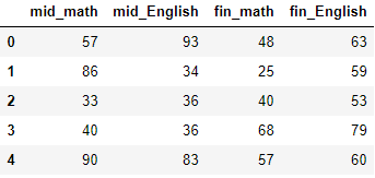 DF.columns = ["mid math", "mid English", "fin math", "fin English"]