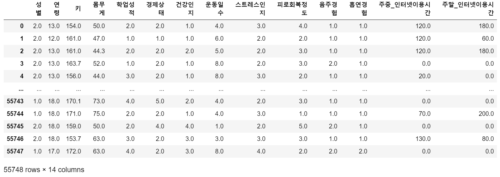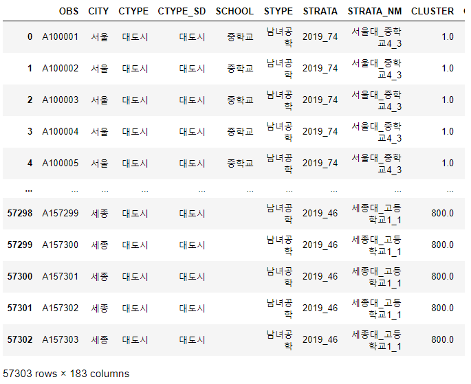 - 총 57303명의 객체(Rows)와 183개의 변수(Columns)가 있는 데이터가 가져와졌다.