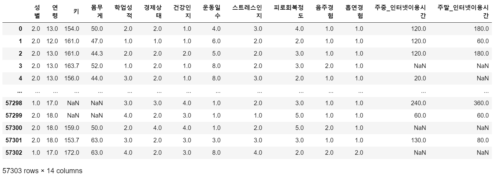 - 연령, 키, 몸무게가 누락된 대상은 전체 데이터 셋 57,303명에서 차지하는 비중이 매우 작으므로, 제거하여 무시하도록 하겠다.