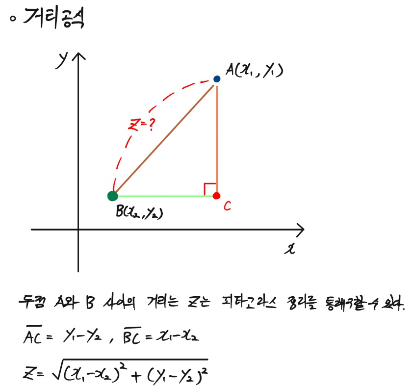 - 위 두 점 사이의 거리는 2차원에서의 거리다. 이번에는 n차원의 공간에서 두 점간의 거리를 알아내는 공식인 유클리디안 거리(Euclidan distance)에 대해 알아보자. 위 2차원에서의 거리 공식과 개념이 매우 유사하다.