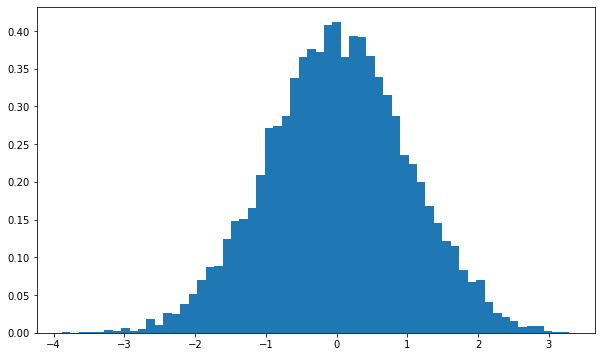 plt.hist(Normal_Dist, bins = 60, density=True)