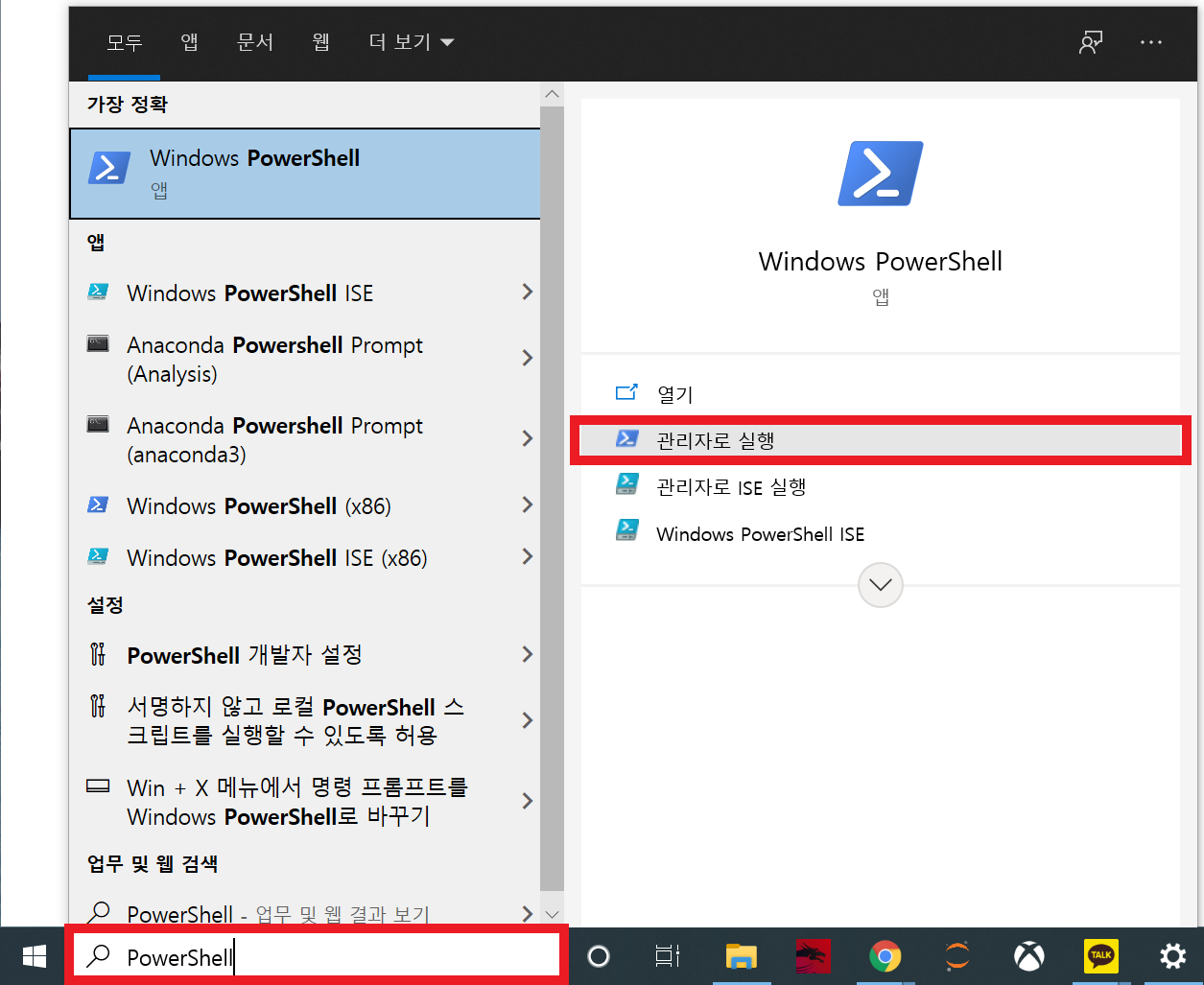 - 설명에서 헷갈릴 수 있는 부분은 "PowerShell의 관리자 권한 실행"이라 생각되는데, 시작 옆의 검색 기능을 이용하면 쉽게 할 수 있다.