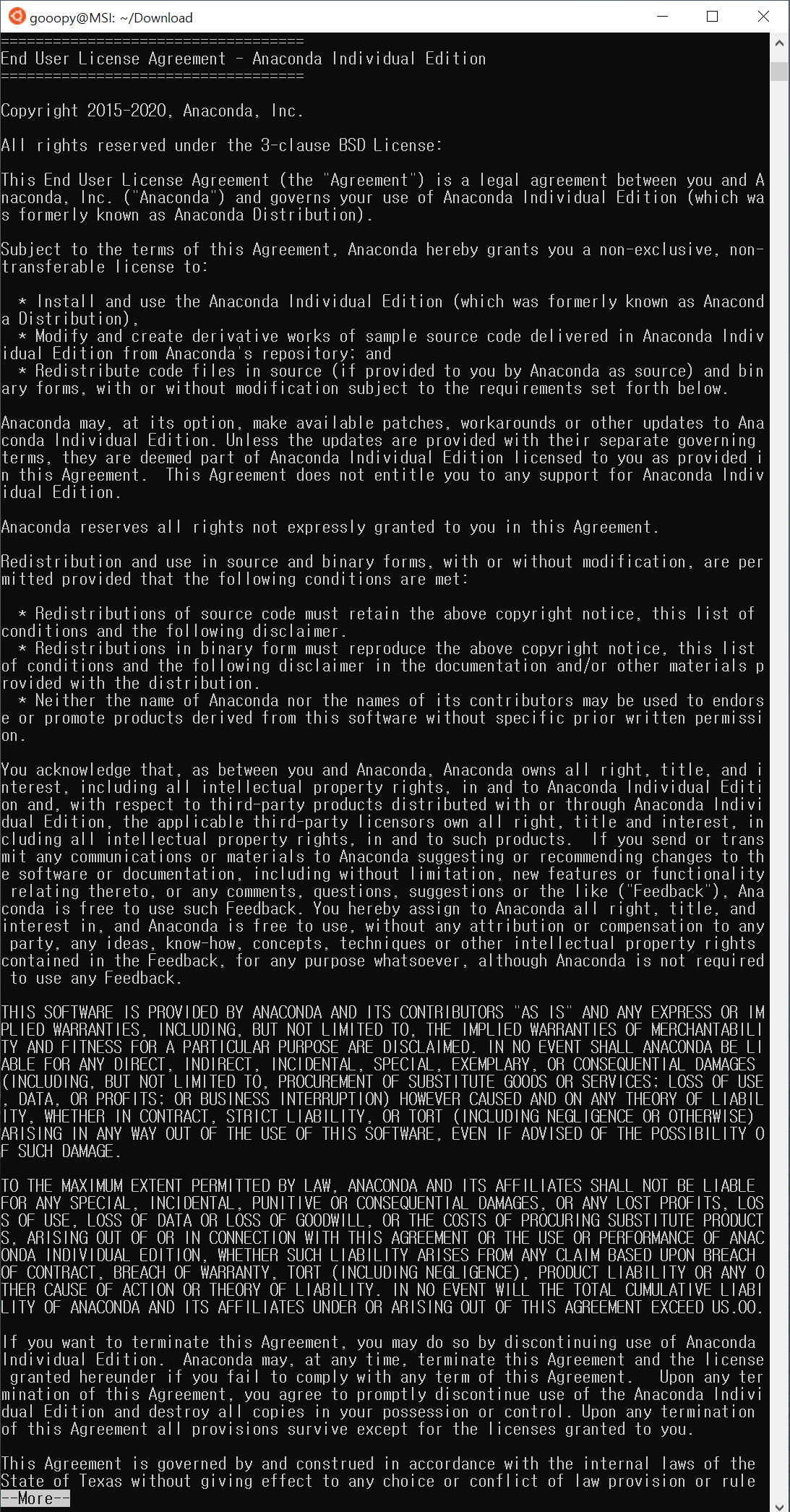 - 뭔가 엄청나게 많은 글이 뜨는데, 아나콘다 설치에 대한 약관이므로, 계속 엔터를 눌러 약관을 끝까지 내려주자.