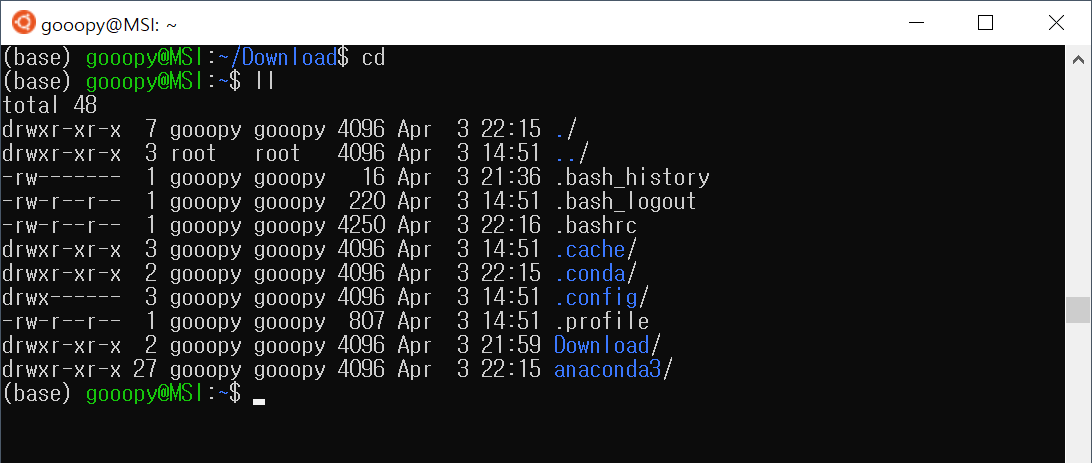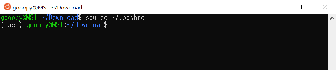 - 위 코드를 진행하면, 맨 왼쪽의 녹색 이름 옆에 (base)라는 글이 붙은 것을 볼 수 있다.