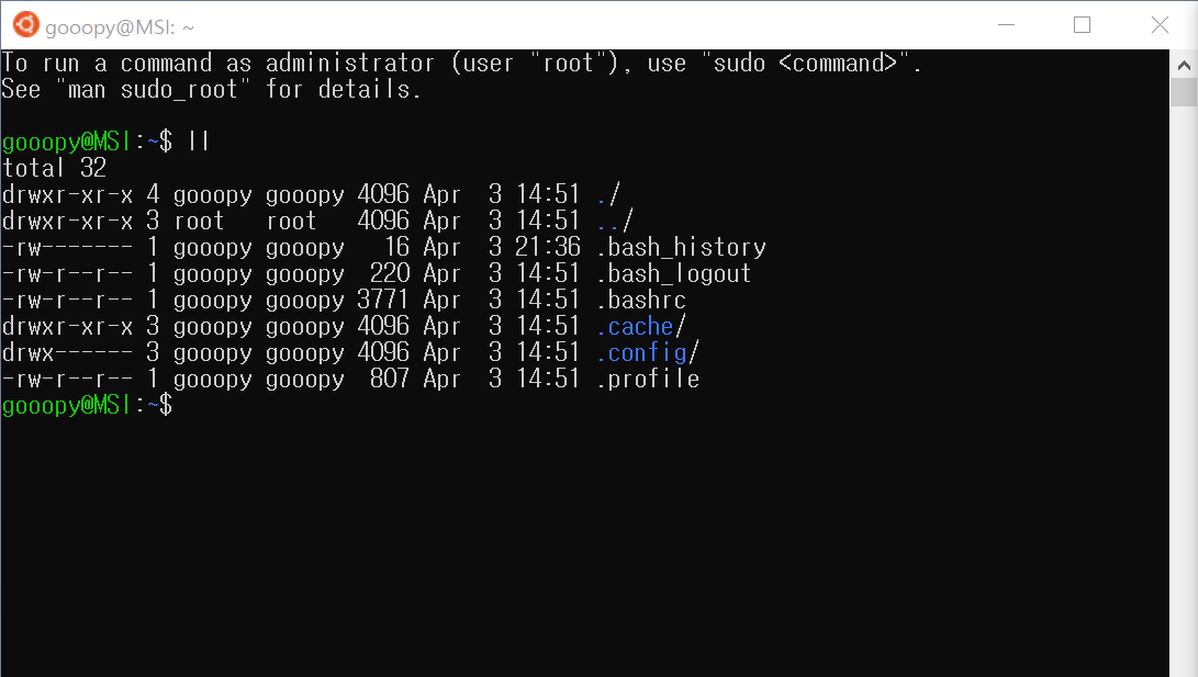 (만약, 위와 같은 화면이 나오지 않는다면, cd를 입력하고 enter를 쳐서, 기본 디렉토리로 이동해주자)