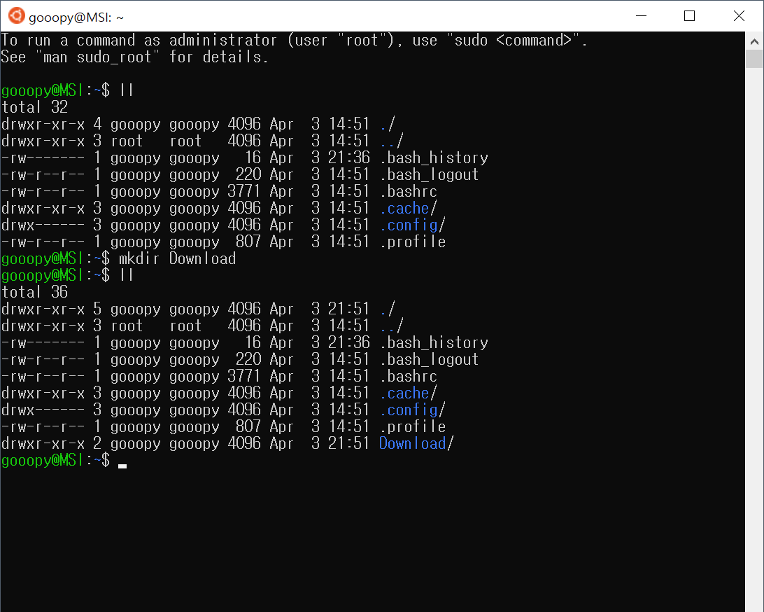 - mkdir 디렉토리_이름: "디렉토리_이름"을 현 디렉토리에 생성한다.