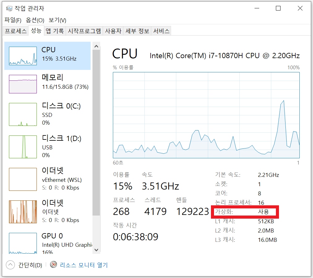 - 가상화 설정: "작업 관리자 > 성능"으로 들어가서 CPU의 가상화가 "사용"으로 되어 있는지 확인한다. 만약 사용이 안되어 있는 경우, BIOS에 들어가서 가상화를 설정해주어야 한다(메인보드 제조사마다 방식이 다르므로, 자신의 메인보드에 맞는 방법을 찾도록 하자).