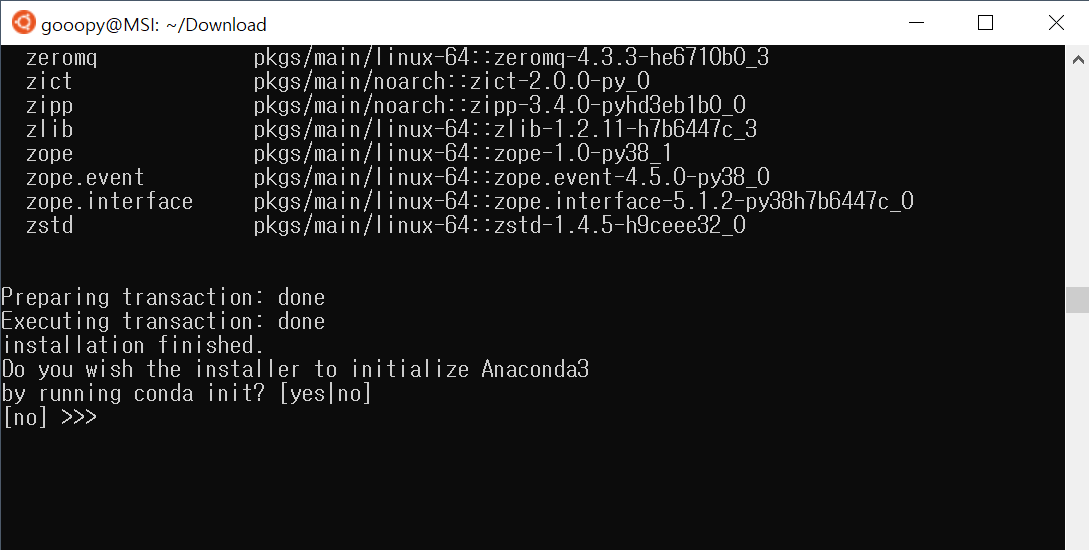 - 위 사진을 보면, 성공적으로 anaconda3가 설치된 것을 볼 수 있다.