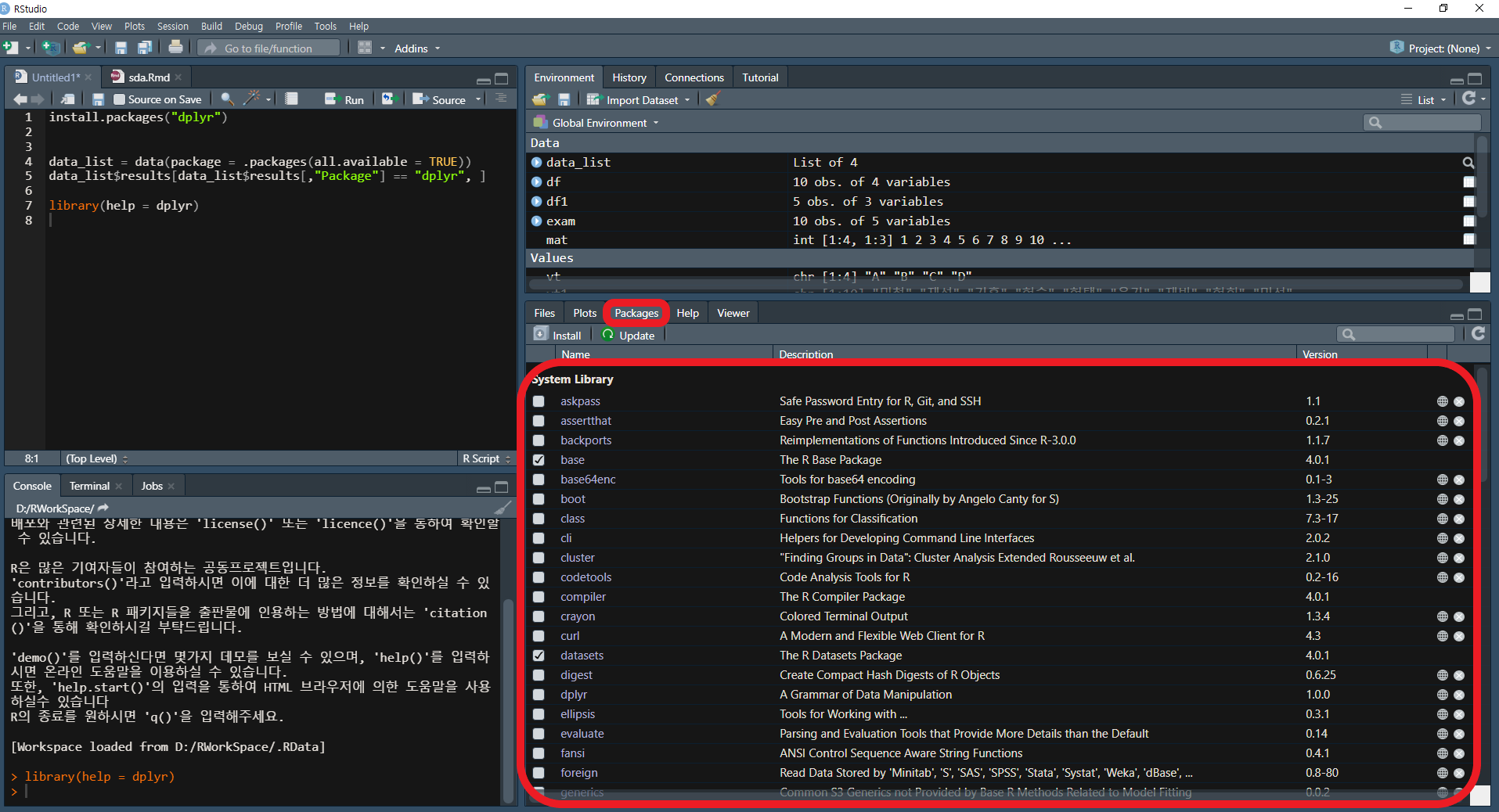 - R을 효율적으로 사용할 수 있게 해주는 RStudio에는, 설치된 패키지, library로 import된 패키지, 패키지 업데이트 등을 쉽게 할 수 있는 창을 따로 제공하고 있다.