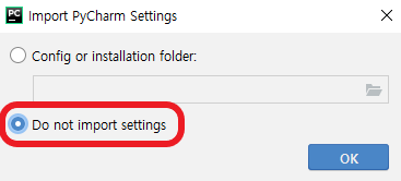 - 파이참 실행이 처음이므로 setting을 import하지 않고 시작하도록 하자.