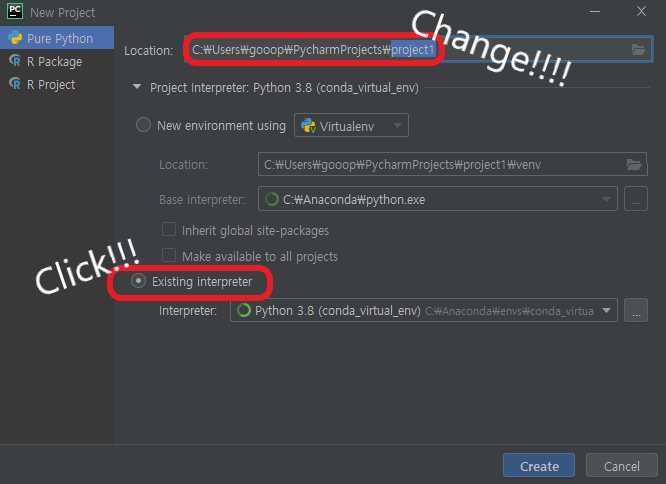 - 방금 환경 셋팅에서 디폴트 Interpreter로 설정한 가상환경을 가지고 오기 위해 Existing interpreter를 체크해주자