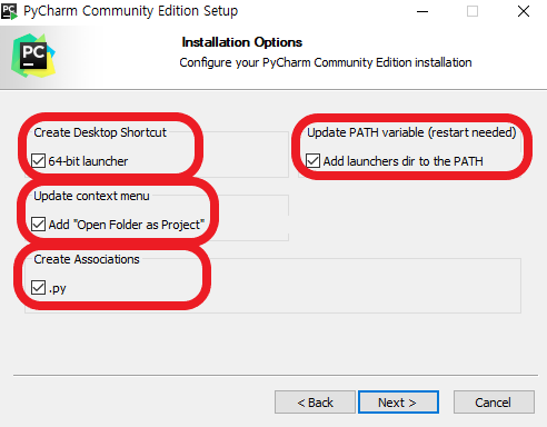 - 바로가기, 폴더에서 프로젝트 바로 열기, PATH에 등록하기 등을 모두 선택.