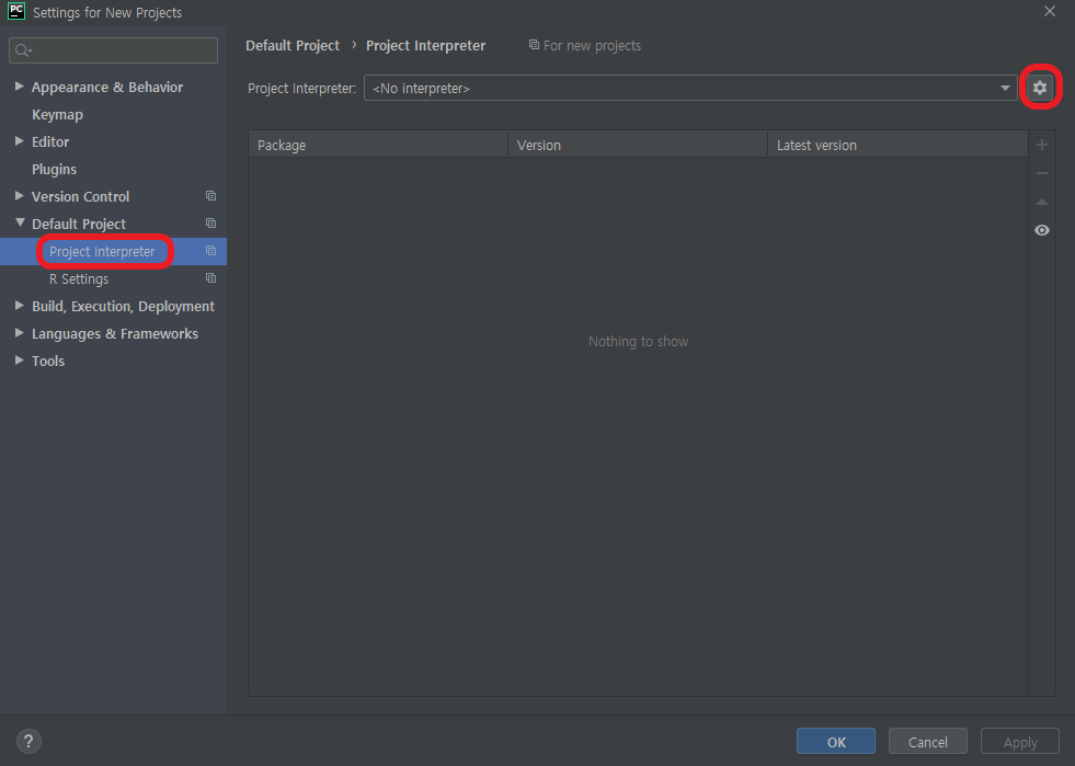 - Default Project > Project Interpreter에 들어가서 아나콘다를 기본 인터프리터(코드를 실행할 프로그램이라고 생각하면 간단하다.)로 설정하자.