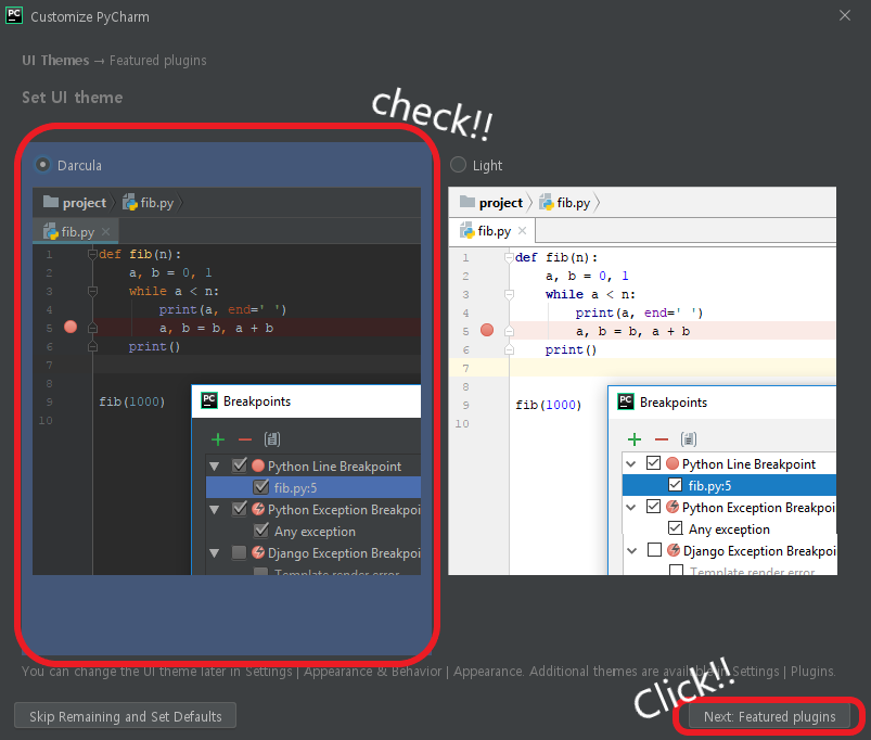 - 눈 보호를 위해, UI 테마를 어두운 화면인 Darucula로 선택하자