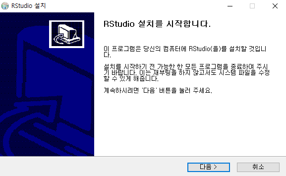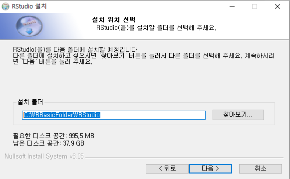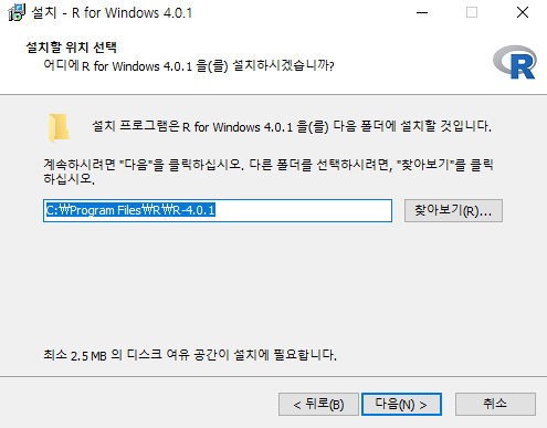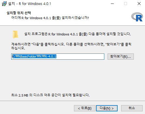 ※ R과 RStudio의 경로 설정은 기본 경로대로 진행해도 딱히 큰 문제는 없으나, 경로 안에 공백이 있으므로, 오류가 발생할 수도 있다고 한다. 그러므로 R과 RStudio 설치 시, 경로를 신경 써주도록 하자.