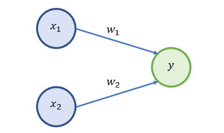 - 노드에서 다음 노드로 정보가 전해질 때, 가중치($w_1$, $w_2$)가 곱해져 전달된다.