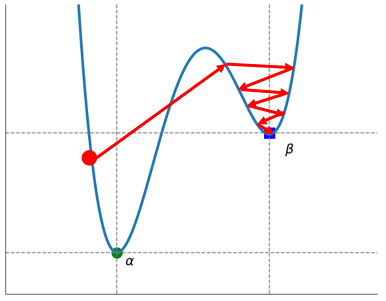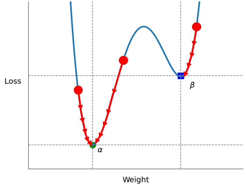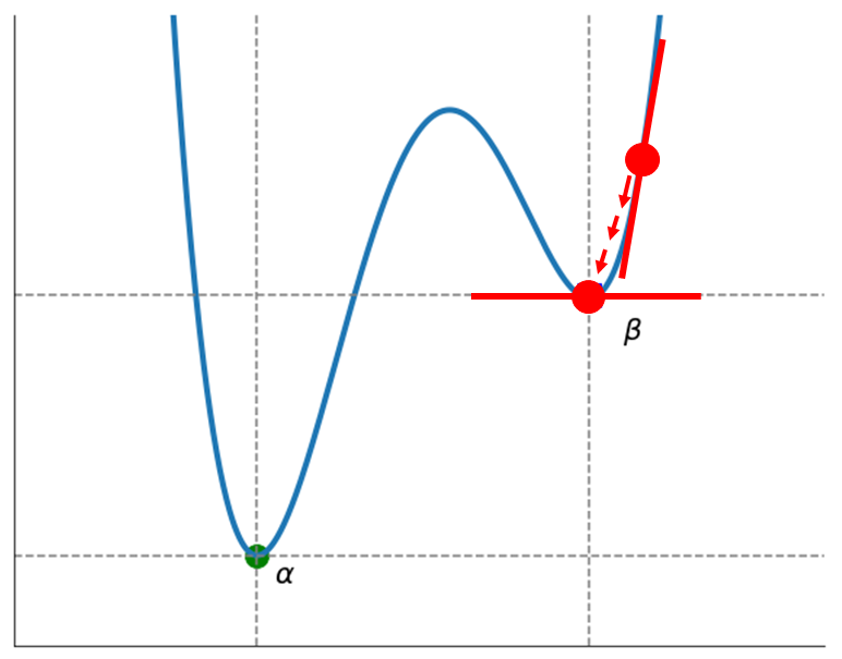- 위 그래프에서 $\alpha$를 전역 최소해(Global minimum), $\beta$를 지역 최소해(Local minimum)라 한다.