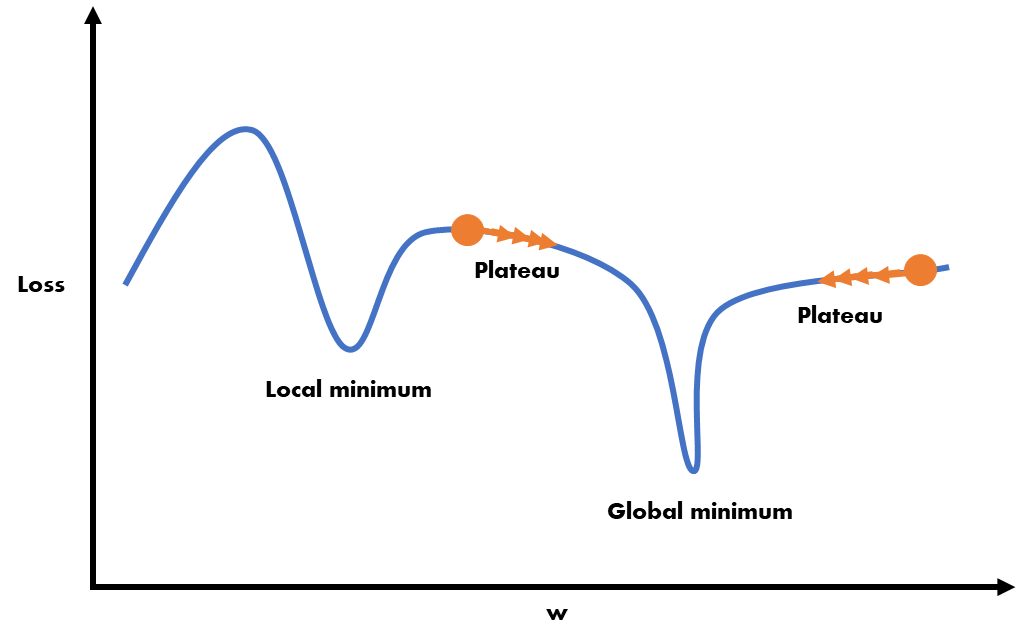 - 위 그래프에서 Plateau(플래튜)라고 불리는 평탄한 영역에서는 학습 속도가 매우 느려지며, 느려지다 못해 정지해버릴 위험이 존재한다.