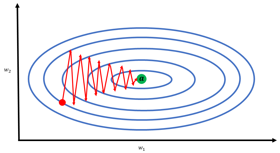 - 위 경우는 매개변수가 2개밖에 존재하지 않았으나, 실제에서는 그 수가 수백만개에 달할 수 있을 정도로 많기 때문에 이러한 Zigzag 현상은 더욱 복잡해지며, 그로 인해 최적해를 찾아가기가 어려워지고, 학습 시간 역시 길어지게 된다.