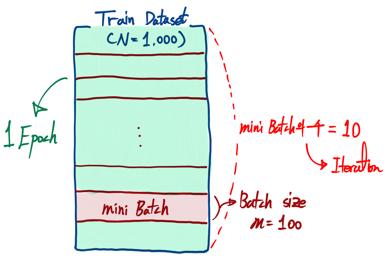- 각 배치마다 파라미터 업데이트가 한 번씩 이루어지므로, Iteration은 "파라미터 업데이트 횟수 = 배치의 수"가 된다.