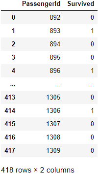 - gender_submission은 Row(행) 418개, Column(열, 변수) 2개로 구성된 데이터다.