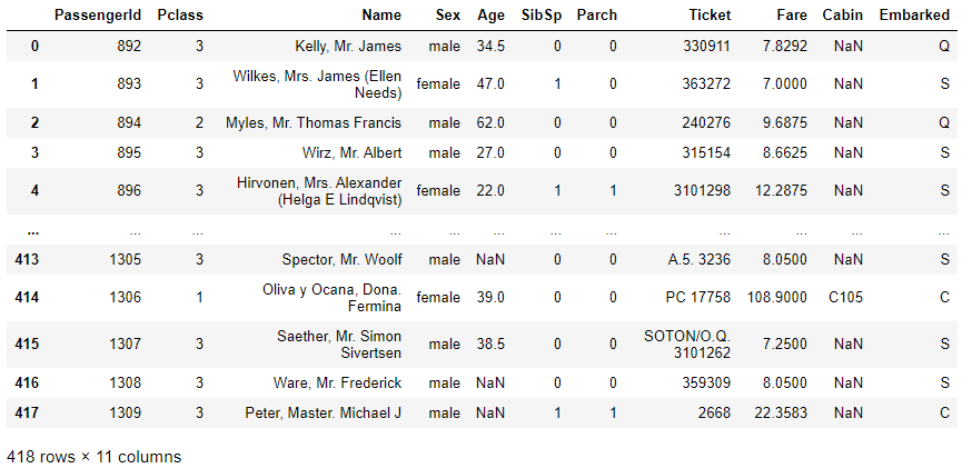- test는 Row(행) 418개, Column(열, 변수) 11개로 구성된 데이터다.