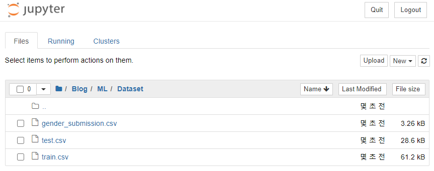 - 이전에 다운로드하였던 titanic 압축파일 안에 있던 3 파일 "gender_submission.csv", "test.csv", "train.csv"을 Upload 시키자.