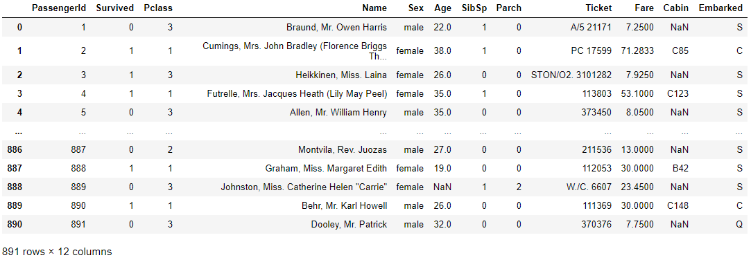 - train은 Row(행) 891개, Column(열, 변수) 12개로 구성된 데이터다.
