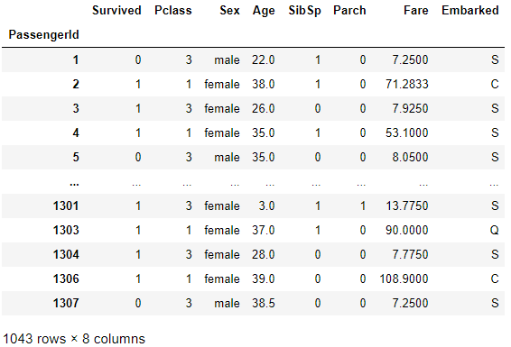 - 결측 값이 있는 행들을 제거하여, 총 행의 수가 1309개에서 1043개로 감소하였다.