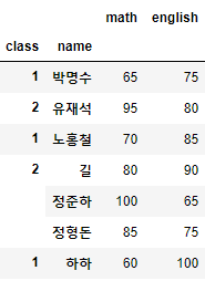 - 멀티 인덱스를 하면, class는 하나의 index로 뭉친 것처럼 보이는데, 눈에만 저렇게 보이지 실제로는 따로 떨어져 있다.