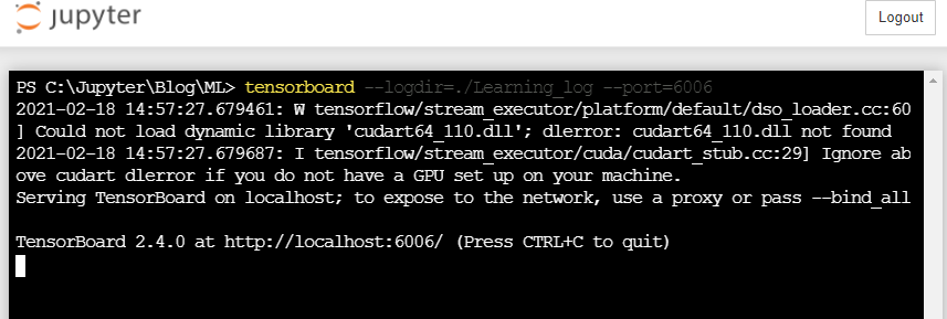 - 위 사진 같이 글이 뜰 것인데 여기서 http://localhost:6006/ 을 주소창에 쓰거나 클릭하면, 텐서보드로 이동한다.