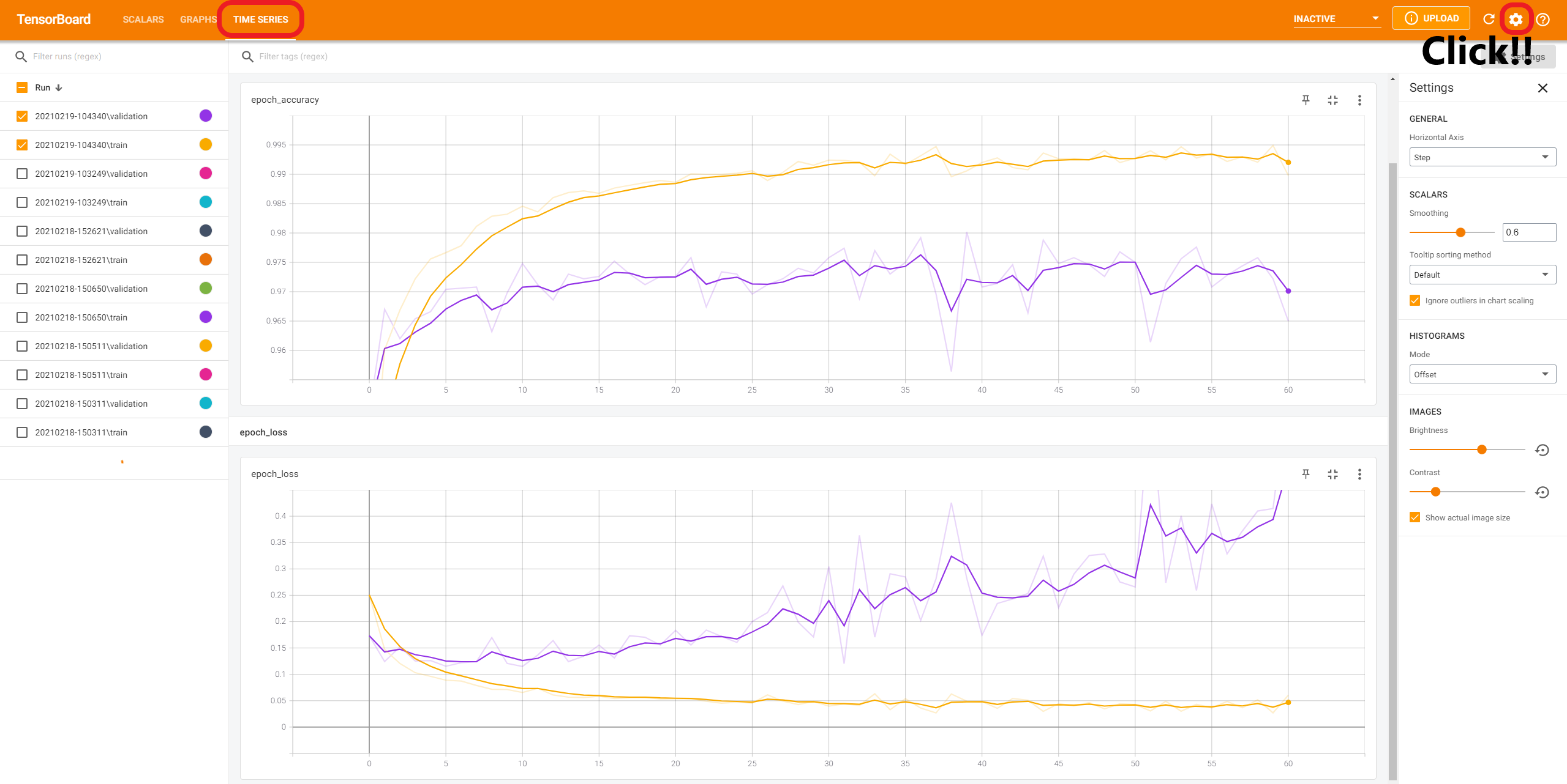 - 그래프를 보면 연한 파란색과 빨간색 그래프가 희미하게 있는 것을 볼 수 있는데, 이 희미한 그래프는 실제 값이고, 이를 부드럽게 만든 것이 우리가 보고 있는 진한 파란색, 빨간색 그래프다. 이 부드러운 정도는 좌측의 "Smoothing" 바를 움직여서 조절할 수 있다.