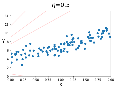 - 위 결과를 보면, 학습률이 커지면 커질수록 빠르게 최적해를 찾아가는 것을 볼 수 있지만, $\eta=0.5$ 같이 지나치게 큰 경우, 모델 파라미터가 큰 폭으로 요동치는 것을 볼 수 있다.