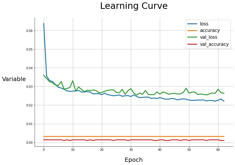 - 굉장히 많은 지표들이 추가되었지만, Early Stopping의 기준으로 사용한 val_loss를 본다면, patience가 30이었으므로, epochs 27에서 모델이 수렴하였다는 것을 알 수 있다.