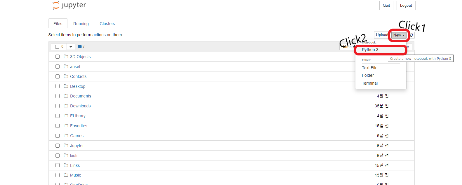 - New 버튼을 클릭하면 Python3, Text File, Folder, Terminal 이라는 버튼이 있다.