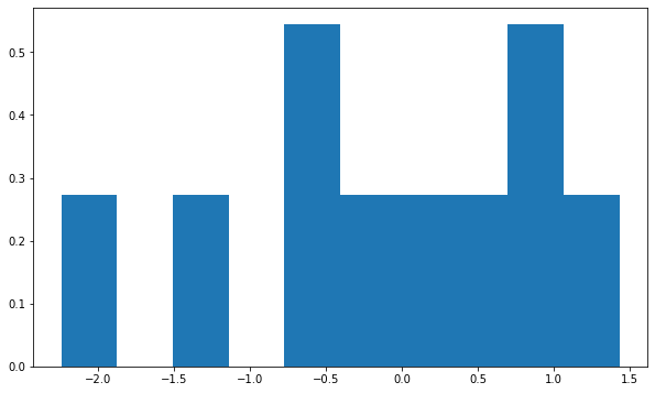 - 이번에 생성한 데이터는 평균이 1, 표준편차가 1로 이전의 난수와 동일하지만, 크기가 10으로 매우 작아, 분산만 동일하지 정규분포로 보기 힘든 데이터를 생성해보았다.