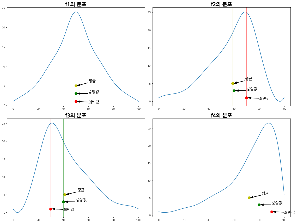 도수분포다각형을 부드럽게 그리고, 최빈값, 중앙값, 평균을 점으로 찍고, 선을 그린다.