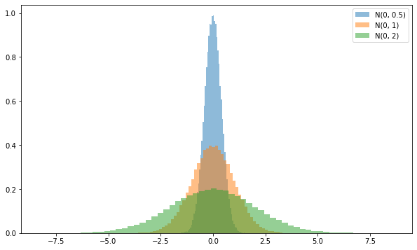 5.5. 표준편차가 다른 분포들을 만들고, 첨도를 비교해보자.