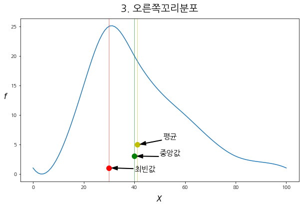 - 오른 꼬리 분포인 경우, "평균 > 중앙값 > 최빈값"이 되는 것을 볼 수 있다.
