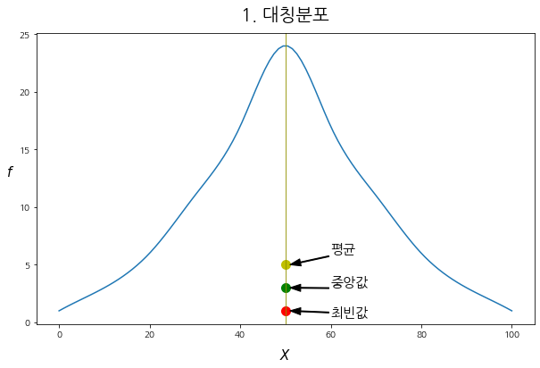 draw_Ske(DF, "f1", "1. 대칭분포")