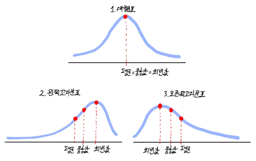 - 집중화 경향치인 평균, 중앙값, 최빈값은 데이터 분포에 따라 아래와 같은 경향을 갖는다.
