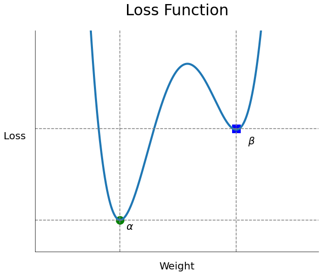 • 위 그래프에서 $\alpha$를 전역 최소해(Global minimum), $\beta$를 지역 최소해(Local minimum)라 한다.